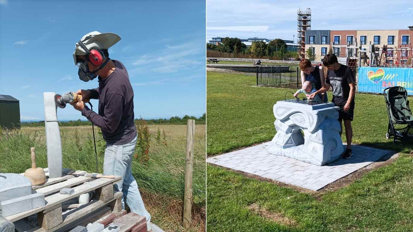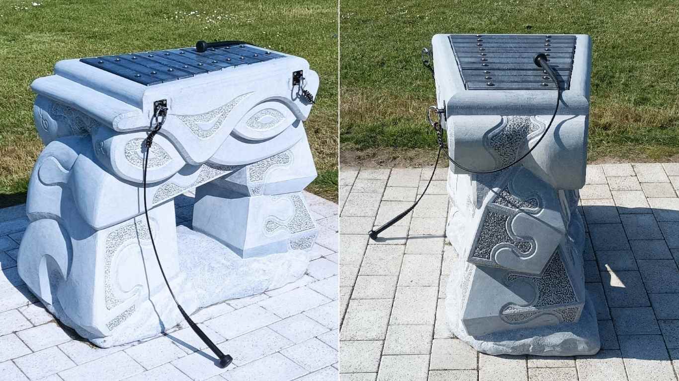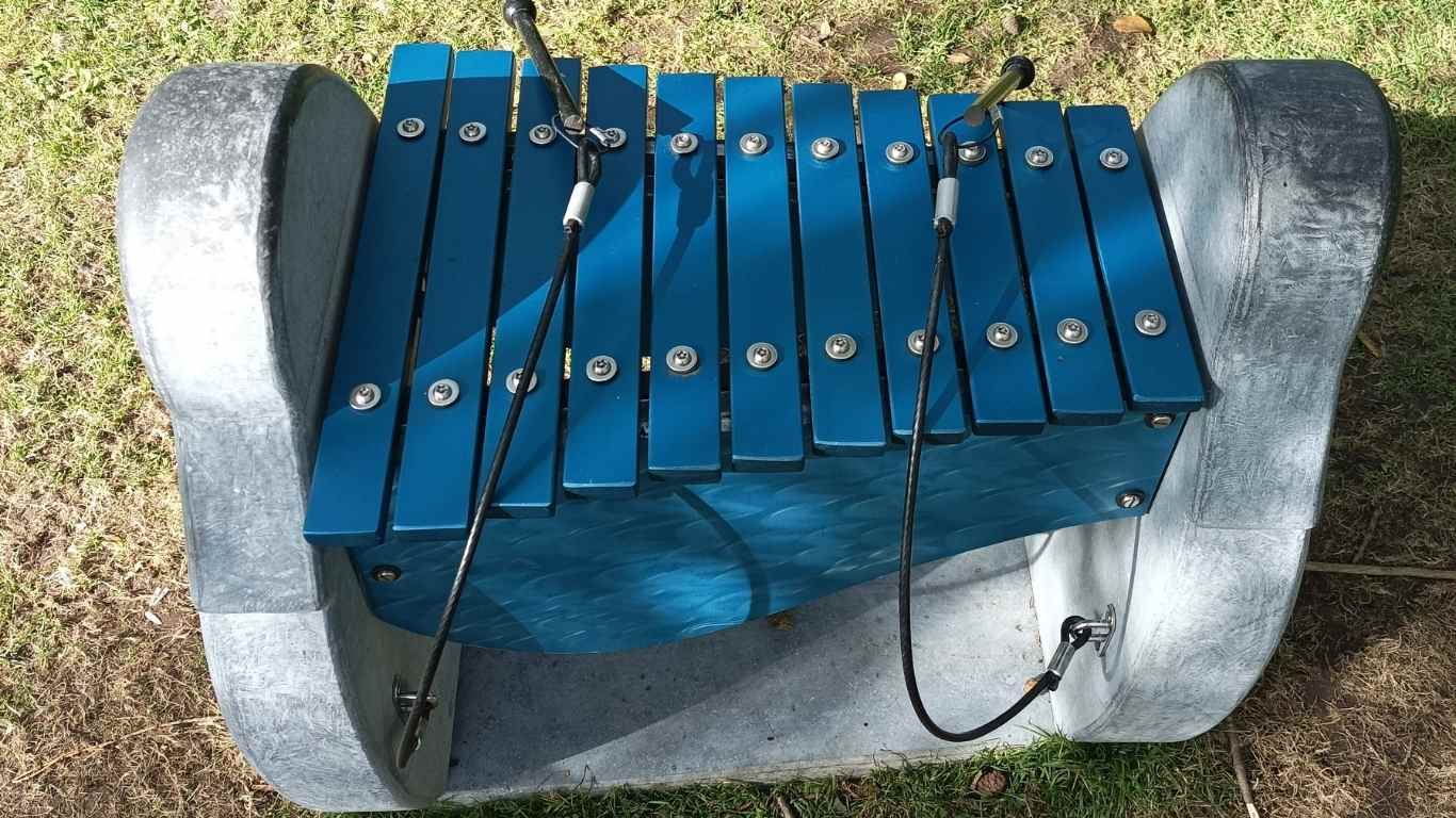 The entire project was quite a challenge and an enormous learning experience for me. When the work was finished—or at least when I thought it was—the musical bars I had incorporated were made of stone. However, after installation, I quickly learned that they were not suitable for public use, as the stone was too brittle. I had to find an alternative. After some research and further trial and error, I decided on aluminium, a material I had no previous experience working with. After two months, I had a new set of aluminium musical bars, which I also had anodised.